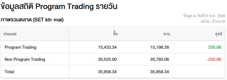 ขณะที่มูลค่าซื้อขายรายวันผ่าน Non Program Trading หรือ “การซื้อขายที่ไม่ใช่โปรแกรม” มีมูลค่าซื้อจำนวน 20,525.00 ล้านบาท และมูลค่าขายจำนวน 20,760.06 ล้านบาท เท่ากับขายสุทธิ 235.06 ล้านบาท