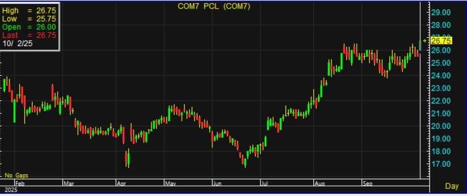 ผู้สื่อข่าวรายงานว่า วันนี้ (2 ต.ค. 68) ราคาหุ้น บริษัท คอมเซเว่น จำกัด (มหาชน) หรือ COM7 ณ เวลา 11:01 น. อยู่ที่ระดับ 26.75 บาท บวก 1.25 บาท หรือ 4.90% สูงสุดที่ระดับ 26.75 บาท ต่ำสุดที่ระดับ 25.75 บาท ด้วยมูลค่าการซื้อขาย 104.60 ล้านบาท