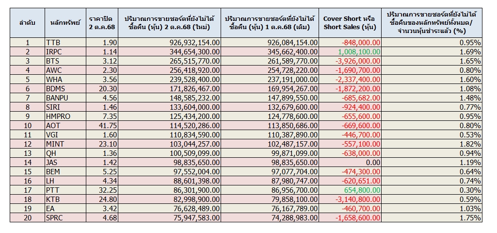 ข้อมูลสิ้นสุด 2 ต.ค.68 พบ TTB มีปริมาณชอร์ตคงค้างเหลือมากสุด 926 ล้านหุ้น คิดเป็น 0.95% ขณะที่ BTS ถูก Short Sales สูงสุด 3.92 ล้านหุ้น ส่วน IRPC ถูก Cover Short สูงสุด 1 ล้านหุ้น