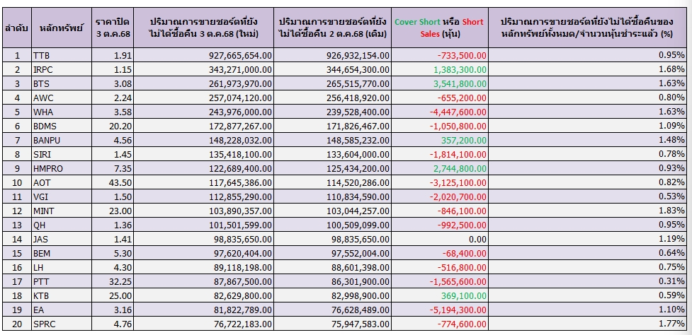 เปิด 20 อันดับหุ้นถูก “Cover-Short” สูงสุด ณ 3 ต.ค.68