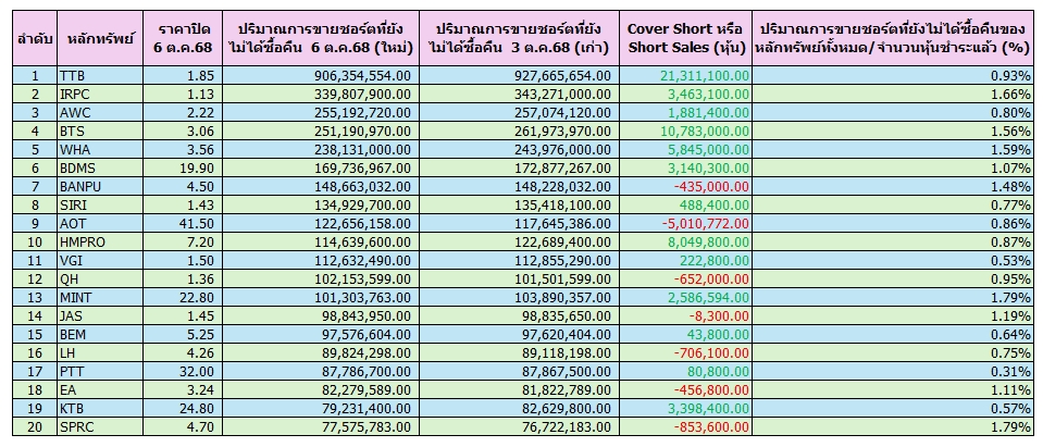 ข้อมูลสิ้นสุด 6 ต.ค.68 พบ TTB มีปริมาณชอร์ตคงค้างเหลือมากสุด 906 ล้านหุ้น คิดเป็น 0.93% และถูก Cover Short สูงสุด 21 ล้านหุ้น ส่วน AOT ถูก Short Sales สูงสุด 5 ล้านหุ้น