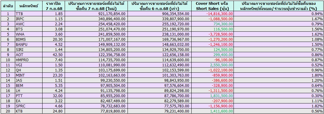 ข้อมูลสิ้นสุด 7 ก.ย.68 พบ TTB มีปริมาณชอร์ตคงค้างเหลือมากสุด 921 ล้านหุ้น คิดเป็น 0.94% และถูก Short Sales สูงสุด 14 ล้านหุ้น ขณะที่ VGI ถูก Cover Short สูงสุด 2.5 ล้านหุ้น