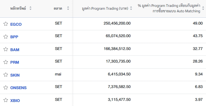 นอกจากนี้ ตลท.ยังรายงานข้อมูลหลักทรัพย์ที่ใช้ Program Trading ซื้อขายสูงสุด 6 อันดับ โดยเรียงจากเปอร์เซ็นต์ (%) มูลค่า Program Trading เทียบกับมูลค่าการซื้อขายแบบ Auto Matching ดังนี้ EGCO, BPP, BAM, PRM, SKIN, ONSENS และ XBIO