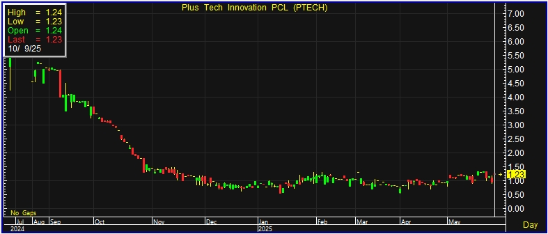 ผู้สื่อข่าวรายงานว่า วันนี้ (9 ต.ค.68) ราคาหุ้น บริษัท พลัส เทค อินโนเวชั่น จำกัด (มหาชน) หรือ PTECH ณ เวลา 11:05 น. อยู่ที่ระดับ 1.23 บาท บวก 0.28 บาท หรือ 29.47% ราคาสูงสุดอยู่ที่ 1.24 บาท ราคาต่ำสุดอยู่ที่ 1.23 บาท ด้วยมูลค่าการซื้อขาย 2,000 บาท