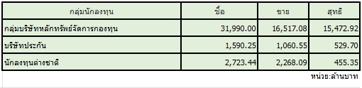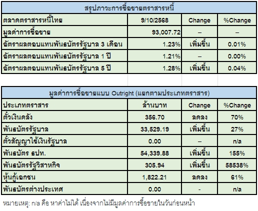 สมาคมตลาดตราสารหนี้ไทย (ThaiBMA) สรุปภาวะตลาดตราสารหนี้ไทยประจำวันนี้มีมูลค่าการซื้อขายรวมทั้งวันอยู่ที่ 93,008 ล้านบาท ด้านประเภทของนักลงทุน ที่มีมูลค่าการซื้อขายสูงที่สุด 2 อันดับแรก คือ 1. กลุ่มบริษัทหลักทรัพย์จัดการกองทุน (บลจ.) ซื้อสุทธิ 15,473 ล้านบาท 2. กลุ่มบริษัทประกัน ซื้อสุทธิ 530 ล้านบาท ในขณะที่นักลงทุนต่างชาติ ซื้อสุทธิ 455 ล้านบาท Yield พันธบัตรอายุ 5 ปี ปิดที่ 1.28% ปรับตัวเพิ่มขึ้นจากเมื่อวาน +0.04%
