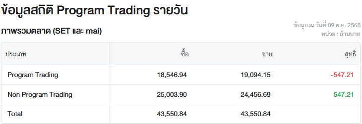 ผู้สื่อข่าวรายงานว่า วันนี้ (9 ต.ค.68) ตลาดหลักทรัพย์แห่งประเทศไทย (ตลท.) เปิดเผยข้อมูลซื้อขายรายวันผ่าน Program Trading หรือ “โปรแกรมโรบอทเทรดดิ้ง” มีมูลค่าซื้อจำนวน 18,546.94 ล้านบาท และมูลค่าขายจำนวน 19,094.15 ล้านบาท เท่ากับขายสุทธิ 547.21 ล้านบาท