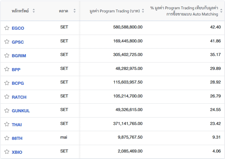 นอกจากนี้ ตลท.ยังรายงานข้อมูลหลักทรัพย์ที่ใช้ Program Trading ซื้อขายสูงสุด 10 อันดับ โดยเรียงจากเปอร์เซ็นต์ (%) มูลค่า Program Trading เทียบกับมูลค่าการซื้อขายแบบ Auto Matching ดังนี้ EGCO, GPSC, BGRIM, BPP, BCPG, RATCH, GUNKUL, THAI, 88TH และ XBIO