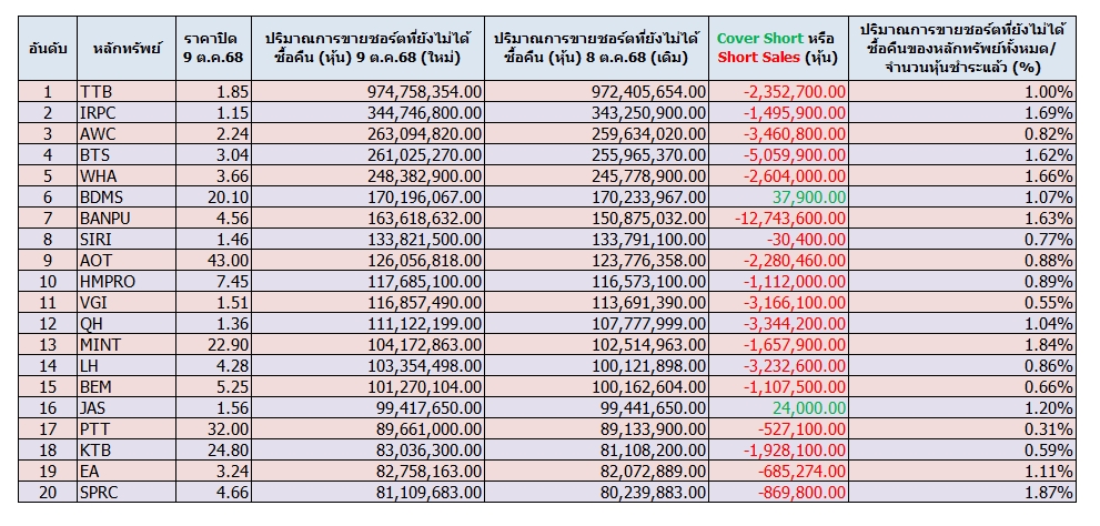 เปิด 20 อันดับหุ้นถูก “Cover-Short” สูงสุด ณ 9 ต.ค.68