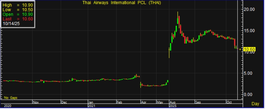 สำหรับาหุ้น THAI ปรับตัวลงต่อเนื่อง จากเมื่อวันที่ 10 ต.ค.ที่ผ่านมา ราคาหุ้น THAI ปรับตัวลดลงอย่างหนัก มาปิดที่ 10.90 บาท ลดลง 5.22% ด้วยมูลค่าซื้อขาย 1,660 ล้านบาท จากความกังวลว่าภาครัฐอาจเข้ามาแทรงแซงการทำงานของการบินไทยเหมือนในอดีต หลังมีการเสนอให้เปิดประชุมสามัญผู้ถือหุ้น (AGM) เป็นการเร่งด่วน เพื่อเสนอชื่อคณะกรรมการชุดใหม่ ทดแทนกรรมการที่หมดวาระ และการเพิ่มจำนวนกรรมการ จาก 11 คน เป็น 15 คน โดยกระทรวงการคลังจะเสนอรายชื่อกรรมการถึง 10 รายชื่อ พร้อมสับสนเสนอ AGM ซ้ำกันในปีเดียวอาจขัดต่อกฎหมายหรือไม่