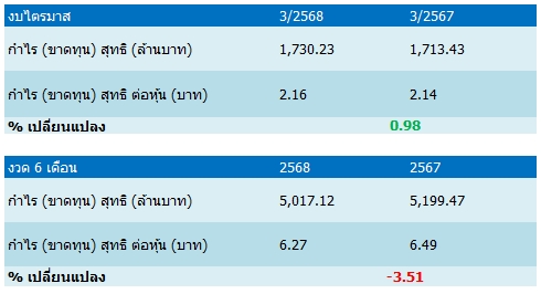 โดยรายงานผลประกอบการไตรมาส 3/2568 อยู่ที่ 1,730.23 ล้านบาท เพิ่มขึ้น 0.98% เมื่อเทียบกับช่วงเดียวกันของปีก่อน อยู่ที่ 1,713.43 ล้านบาท โดยมีปัจจัยสนับสนุนจากรายได้รวมเติบโต 10.1% ประกอบด้วยรายได้ดอกเบี้ยสุทธิ เพิ่มขึ้น 1.3% จากต้นทุนเงินทุนที่ปรับลดลง สอดคล้องกับภาวะดอกเบี้ยขาลง อีกทั้งมีรายได้ค่าธรรมเนียมธุรกิจธนาคารพาณิชย์ เพิ่มขึ้น 16.9% จากการฟื้นตัวของ ธุรกิจนายหน้าประกันภัย เป็นไปตามปริมาณการปล่อยสินเชื่อใหม่ที่ปรับตัวดีขึ้น