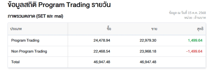 ผู้สื่อข่าวรายงานว่า วันนี้ (15 ต.ค.68) ตลาดหลักทรัพย์แห่งประเทศไทย (ตลท.) เปิดเผยข้อมูลซื้อขายรายวันผ่าน Program Trading หรือ “โปรแกรมโรบอทเทรดดิ้ง” มีมูลค่าซื้อจำนวน 24,478.94 ล้านบาท และมูลค่าขายจำนวน 22,979.30 ล้านบาท เท่ากับซื้อสุทธิ 1,499.64 ล้านบาท