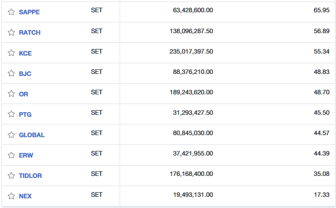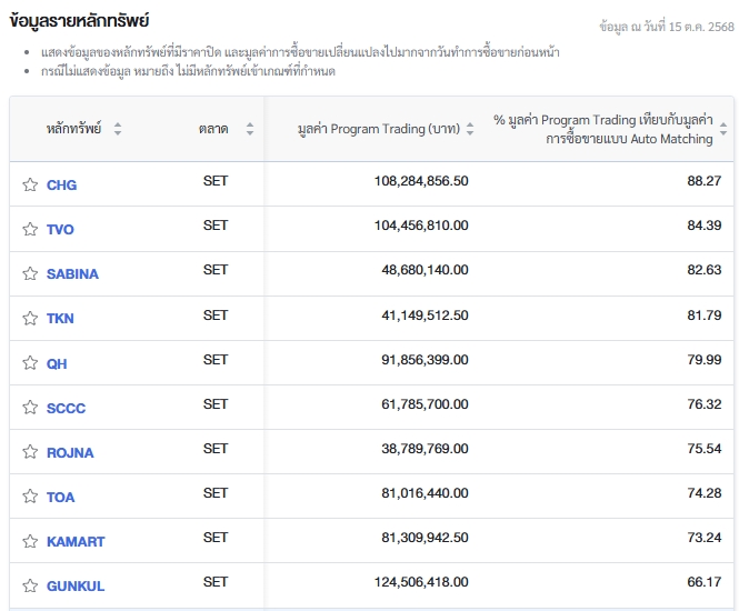 นอกจากนี้ ตลท.ยังรายงานข้อมูลหลักทรัพย์ที่ใช้ Program Trading ซื้อขายสูงสุด 20 อันดับ โดยเรียงจากเปอร์เซ็นต์ (%) มูลค่า Program Trading เทียบกับมูลค่าการซื้อขายแบบ Auto Matching ดังนี้