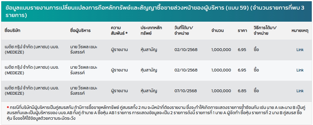 สำนักงานคณะกรรมการกำกับหลักทรัพย์และตลาดหลักทรัพย์ (ก.ล.ต.) เปิดเผยข้อมูลในรายงานการเปลี่ยนแปลงการถือหลักทรัพย์และสัญญาซื้อขายล่วงหน้าของผู้บริหาร (แบบ 59) ประจำวันที่ 15 ตุลาคม 2568 ว่า นายวีรพล เขมะรังสรรค์ ประธานเจ้าหน้าที่บริหาร บริษัท เมดีซ กรุ๊ป จำกัด (มหาชน) หรือ MEDEZE ได้เข้าทำรายการซื้อหุ้น MEDEZE รวม 3 รายการดังต่อไปนี้