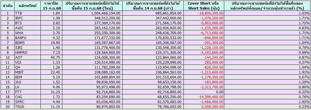 เปิด 20 อันดับหุ้นถูก “Cover-Short” สูงสุด ณ 15 ต.ค.68