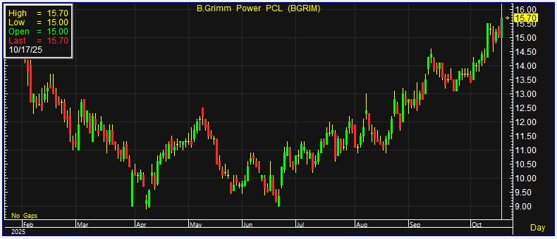 ผู้สื่อข่าวรายงานว่า วันนี้ (17 ต.ค.68) ราคาหุ้น บริษัท บี.กริม เพาเวอร์ จำกัด (มหาชน) หรือ BGRIM ณ เวลา 10:36 น. อยู่ที่ระดับ 15.70 บาท บวก 0.60 บาท หรือ 3.97% ราคาสูงสุดอยู่ที่ 15.70 บาท ราคาต่ำสุดอยู่ที่ 15.00 บาท ด้วยมูลค่าการซื้อขาย 159.76 ล้านบาท