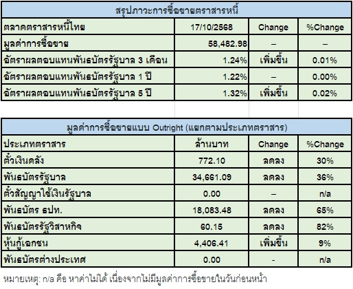 สมาคมตลาดตราสารหนี้ไทย (ThaiBMA) สรุปภาวะตลาดตราสารหนี้ไทยประจำวันนี้มีมูลค่าการซื้อขายรวมทั้งวันอยู่ที่ 58,483 ล้านบาท ด้านประเภทของนักลงทุน ที่มีมูลค่าการซื้อขายสูงที่สุด 2 อันดับแรก คือ 1. กลุ่มบริษัทหลักทรัพย์จัดการกองทุน (บลจ.) ขายสุทธิ 9,303 ล้านบาท 2. กลุ่มบริษัทประกัน ขายสุทธิ 144 ล้านบาท ในขณะที่นักลงทุนต่างชาติ ซื้อสุทธิ 3,060 ล้านบาท Yield พันธบัตรอายุ 5 ปี ปิดที่ 1.32% ปรับตัวเพิ่มขึ้นจากเมื่อวาน +0.02%