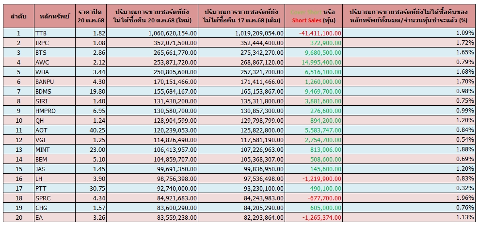ข้อมูลสิ้นสุด 20 ต.ค.68 พบ TTB มีปริมาณชอร์ตคงค้างเหลือมากสุด 1 พันล้านหุ้น คิดเป็น 1.09% และถูก Short Sales สูงสุด 41 ล้านหุ้น ขณะที่ AWC ถูก Cover Short สูงสุด 14.99 ล้านหุ้น