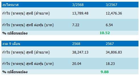 ส่วนงวด 9 เดือน ปี 2568 ธนาคารมีกำไรสุทธิส่วนที่เป็นของธนาคารจำนวน 38,247 ล้านบาท เพิ่มขึ้น 9.9% เมื่อเทียบกับงวดเดียวกันปีก่อนอยู่ที่ 34,806.83 ล้านบาท เป็นผลจากการบริหารสินทรัพย์ด้วยการกระจายแหล่งที่มาของรายได้ที่หลากหลาย ท่ามกลางความท้าทายทางเศรษฐกิจหลายด้าน โดยมีรายได้ที่มิใช่ดอกเบี้ยเพิ่มขึ้นส่วนใหญ่จากกำไรสุทธิจากเครื่องมือทางการเงินที่วัดมูลค่าด้วยมูลค่ายุติธรรมผ่านกำไรหรือขาดทุน และกำไรจากเงินลงทุน ขณะที่รายได้ดอกเบี้ยสุทธิลดลงตามทิศทางของอัตราดอกเบี้ย
