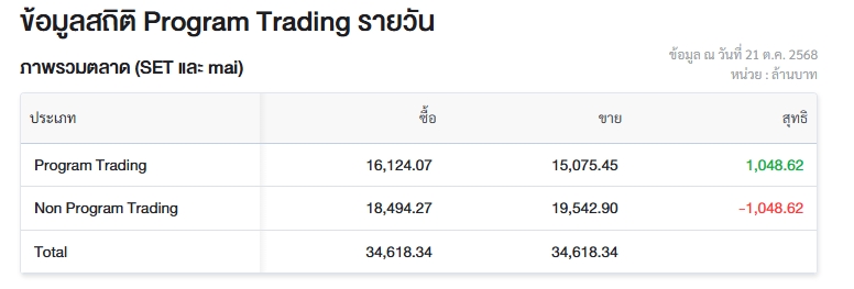 ผู้สื่อข่าวรายงานว่า วันนี้ (21 ต.ค.68) ตลาดหลักทรัพย์แห่งประเทศไทย (ตลท.) เปิดเผยข้อมูลซื้อขายรายวันผ่าน Program Trading หรือ “โปรแกรมโรบอทเทรดดิ้ง” มีมูลค่าซื้อจำนวน 16,124.07 ล้านบาท และมูลค่าขายจำนวน 15,075.45 ล้านบาท เท่ากับซื้อสุทธิ 1,048.62 ล้านบาท