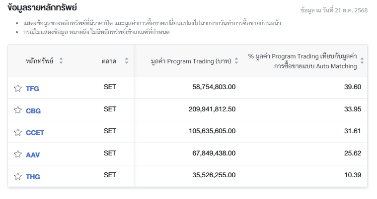 นอกจากนี้ ตลท.ยังรายงานข้อมูลหลักทรัพย์ที่ใช้ Program Trading ซื้อขายสูงสุด อันดับ โดยเรียงจากเปอร์เซ็นต์ (%) มูลค่า Program Trading เทียบกับมูลค่าการซื้อขายแบบ Auto Matching ดังนี้ TFG, CBG, CCET, AAV, THG