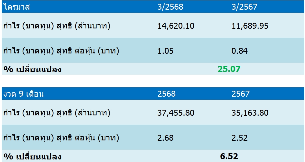 สำหรับ KTB รายงานผลประกอบการไตรมาส 3/68 มีกำไรสุทธิอยู่ที่ 14,620.10 ล้านบาท เพิ่มขึ้น 25.07% เมื่อเทียบกับงวดเดียวกันของปีก่อนมีกำไรสุทธิอยู่ที่ 11,689.95 ล้านบาท เป็นผลมาจากรายได้จากการดำเนินงานขยายตัว 3.4% ได้แรงหนุนจากการเติบโตของธุรกิจตลาดเงิน ตลาดทุน และกำไรจากเงินลงทุนในตราสารหนี้และอัตราแลกเปลี่ยนตามภาวะตลาด รวมถึงรายได้ค่าธรรมเนียมที่เพิ่มขึ้น 3.7% จากธุรกิจบริหารความมั่งคั่ง (Wealth Management)