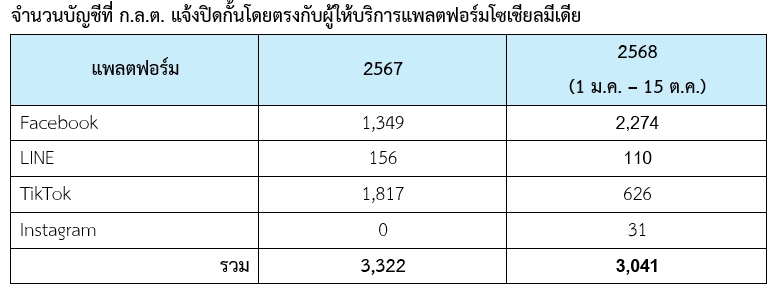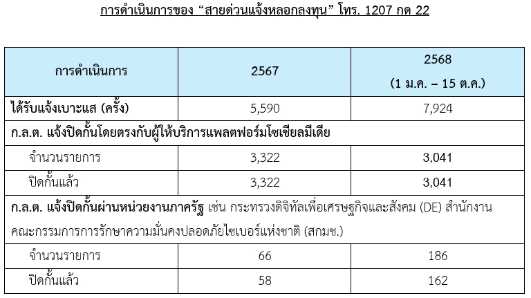 ผู้สื่อข่าวรายงานว่า ตามสถิติการดำเนินการของ “สายด่วนแจ้งหลอกลงทุน” ในปี 2568 (1 ม.ค. – 15 ต.ค.) สำนักงานคณะกรรมการกำกับหลักทรัพย์และตลาดหลักทรัพย์ (ก.ล.ต.) ได้รับแจ้งเบาะแสหลอกลงทุน รวมทั้งสิ้น 7,924 ครั้ง ผ่านระบบรับแจ้งใน 7 ช่องทาง ได้แก่ เว็บไซต์สำนักงาน ก.ล.ต. (www.sec.or.th/scamalert) โทรศัพท์ (1207 กด 22) อีเมล ([email protected]) การเดินทางมายังสำนักงาน ระบบบริการสนทนา (Facebook และ Live chat) และไปรษณีย์ โดยมีบัญชีโซเชียลมีเดียเข้าข่ายหลอกลงทุนที่ประสานผู้ให้บริการแพลตฟอร์มโซเชียลมีเดียและหน่วยงานภาครัฐเพื่อปิดกั้น จำนวน 3,227 บัญชี โดยผู้ให้บริการแพลตฟอร์มโซเชียลมีเดียได้ปิดกั้นไปแล้วร้อยละ 100 ภายในเวลา 7 นาที – 48 ชั่วโมง และให้คำปรึกษาในเรื่องการหลอกลงทุน จำนวน 4,697 ครั้ง