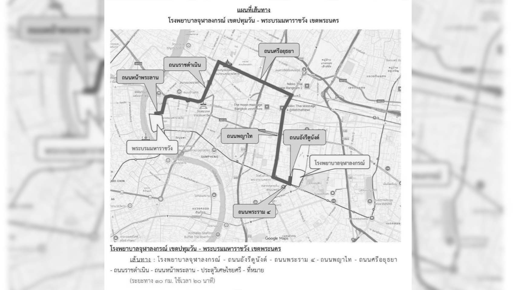 เส้นทางใช้ โรงพยาบาลจุฬาลงกรณ์ เลี้ยวซ้าย ถ.อังรีดูนังต์ แล้วเลี้ยวขวาออกเส้น ถ.พระราม 4 แยกสามย่านเลี้ยวขวาเข้า ถ.พญาไท แยกพญาไทเลี้ยวซ้ายเข้า ถ.ศรีอยุธยา ผ่าน 901 Land ผ่าน วัดเบญจมบพิตรดุสิตวนารามราชวรวิหาร เลี้ยวซ้ายเข้า ถ.ราชดำเนิน ระยะทางประมาณ 10 กม.