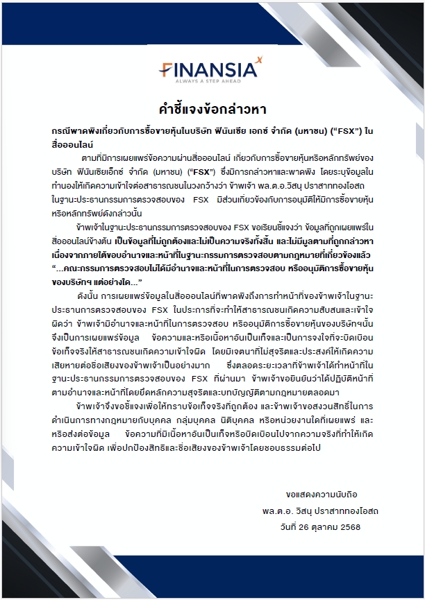 พล.ต.อ.วิสนุ ปราสาททองโอสถ เปิดเผยว่า ตามที่มีการเผยแพร่ข้อความผ่านสื่อออนไลน์ เกี่ยวกับการซื้อขายหุ้นหรือหลักทรัพย์ของ บริษัท ฟินันเซียเอ็กซ์ จำกัด (มหาชน) หรือ FSX ซึ่งมีการกล่าวหาและพาดพิง โดยระบุข้อมูลในทำนองให้เกิดความเข้าใจต่อสาธารณชนในวงกว้างว่า ข้าพเจ้า พล.ต.อ.วิสนุ ปราสาททองโอสถ ในฐานะประธานกรรมการตรวจสอบของ FSX มีส่วนเกี่ยวข้องกับการอนุมัติให้มีการซื้อขายหุ้นหรือหลักทรัพย์ดังกล่าวนั้น
