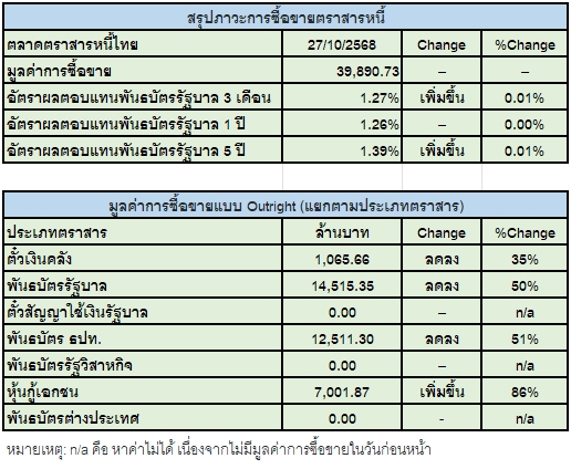 สมาคมตลาดตราสารหนี้ไทย (ThaiBMA) สรุปภาวะตลาดตราสารหนี้ไทยประจำวันนี้มีมูลค่าการซื้อขายรวมทั้งวันอยู่ที่ 39,891 ล้านบาท ด้านประเภทของนักลงทุน ที่มีมูลค่าการซื้อขายสูงที่สุด 2 อันดับแรก คือ 1. กลุ่มบริษัทหลักทรัพย์จัดการกองทุน (บลจ.) ซื้อสุทธิ 7,194 ล้านบาท 2. กลุ่มบริษัทประกัน ขายสุทธิ 251 ล้านบาท ในขณะที่นักลงทุนต่างชาติ ซื้อสุทธิ 1,039 ล้านบาท Yield พันธบัตรอายุ 5 ปี ปิดที่ 1.39% ปรับตัวเพิ่มขึ้นจากเมื่อวาน +0.01%