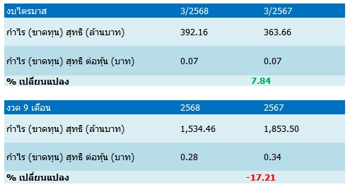บริษัทฯ มีผลกำไรสุทธิประจำไตรมาสที่ 3/2568 จำนวน 392.16 ล้านบาท เพิ่มขึ้น  7.84% เมื่อเทียบกับระยะเวลาเดียวกันของปี 2567 อยู่ที่ 363.66 ล้านบาท โดยมาจากรายได้จากการขายประจำไตรมาส 3/2568 อยู่ที่ 7,416.04 ล้านบาท เพิ่มขึ้นจากระยะเวลาเดียวกันของปี 2567 จำนวน 234.28 ล้านบาท หรือ 3.26%