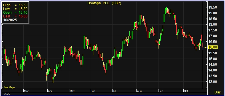 ผู้สื่อข่าวรายงานว่า วันนี้ (28 ต.ค.68) ราคาหุ้น บริษัท โอสถสภา จำกัด (มหาชน) หรือ OSP ณ เวลา 11:07 น. อยู่ที่ระดับ 16 บาท ลบ 0.60 บาท หรือ 3.61% ราคาสูงสุดอยู่ที่ 16.50 บาท ราคาต่ำสุดอยู่ที่ 15.80 บาท ด้วยมูลค่าการซื้อขาย 87.84 ล้านบาท