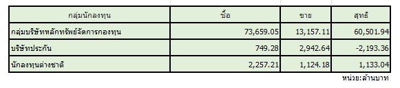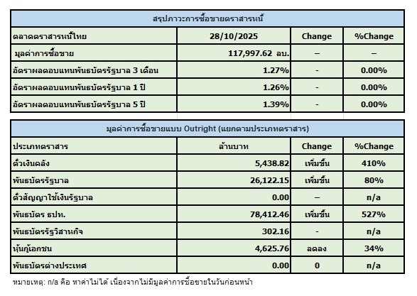 สมาคมตลาดตราสารหนี้ไทย (ThaiBMA) สรุปภาวะตลาดตราสารหนี้ไทยประจำวันนี้ มีมูลค่าการซื้อขายรวมทั้งวันอยู่ที่ 117,998 ล้านบาท ด้านประเภทของนักลงทุน ที่มีมูลค่าการซื้อขายสูงที่สุด 2 อันดับแรก คือ 1. กลุ่มบริษัทหลักทรัพย์จัดการกองทุน (บลจ.) ซื้อสุทธิ 60,502 ล้านบาท 2. กลุ่มบริษัทประกัน ขายสุทธิ 2,193 ล้านบาท ในขณะที่นักลงทุนต่างชาติ ซื้อสุทธิ 1,133 ล้านบาท