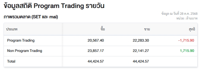 ขณะที่ มูลค่าซื้อขายรายวันผ่าน Non Program Trading หรือ “การซื้อขายที่ไม่ใช่โปรแกรม” มีมูลค่าซื้อจำนวน 23,857.17 ล้านบาท และมูลค่าขายจำนวน 22,141.27 ล้านบาท เท่ากับซื้อสุทธิ 1,715.90 ล้านบาท