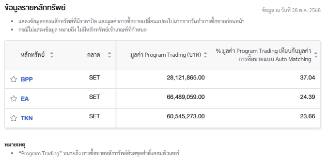 นอกจากนี้ ตลท. ยังรายงานข้อมูลหลักทรัพย์ที่ใช้ Program Trading ซื้อขายสูงสุด 3 อันดับ โดยเรียงจากเปอร์เซ็นต์ (%) มูลค่า Program Trading เทียบกับมูลค่าการซื้อขายแบบ Auto Matching ดังนี้