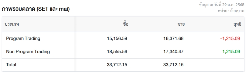 ผู้สื่อข่าวรายงานว่า วันนี้ (29 ต.ค.68) ตลาดหลักทรัพย์แห่งประเทศไทย (ตลท.) เปิดเผยข้อมูลซื้อขายรายวันผ่าน Program Trading หรือ “โปรแกรมโรบอทเทรดดิ้ง” พบว่ามีมูลค่าซื้อจำนวน 15,156.59 ล้านบาท และมูลค่าขายจำนวน 16,371.68 ล้านบาท เท่ากับขายสุทธิ 1,215.09 ล้านบาท
