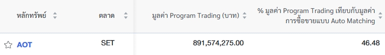 นอกจากนี้ ตลาดหลักทรัพย์แห่งประเทศไทย (ตลท.) รายงานข้อมูลหลักทรัพย์ที่มีการซื้อขายผ่านระบบ Program Trading สูงสุด โดยพิจารณาจากสัดส่วนมูลค่า Program Trading เทียบกับมูลค่าการซื้อขายแบบ Auto Matching พบว่า หลักทรัพย์ที่มีการทำรายการสูงสุดในวันนี้ ได้แก่ บริษัท ท่าอากาศยานไทย จำกัด (มหาชน) หรือ AOT มีมูลค่าการซื้อขายผ่าน Program Trading จำนวน 891.57 ล้านบาท คิดเป็น 46.48% ของมูลค่าการซื้อขายแบบ Auto Matching ซึ่งอยู่ที่ 1,918.55 ล้านบาท