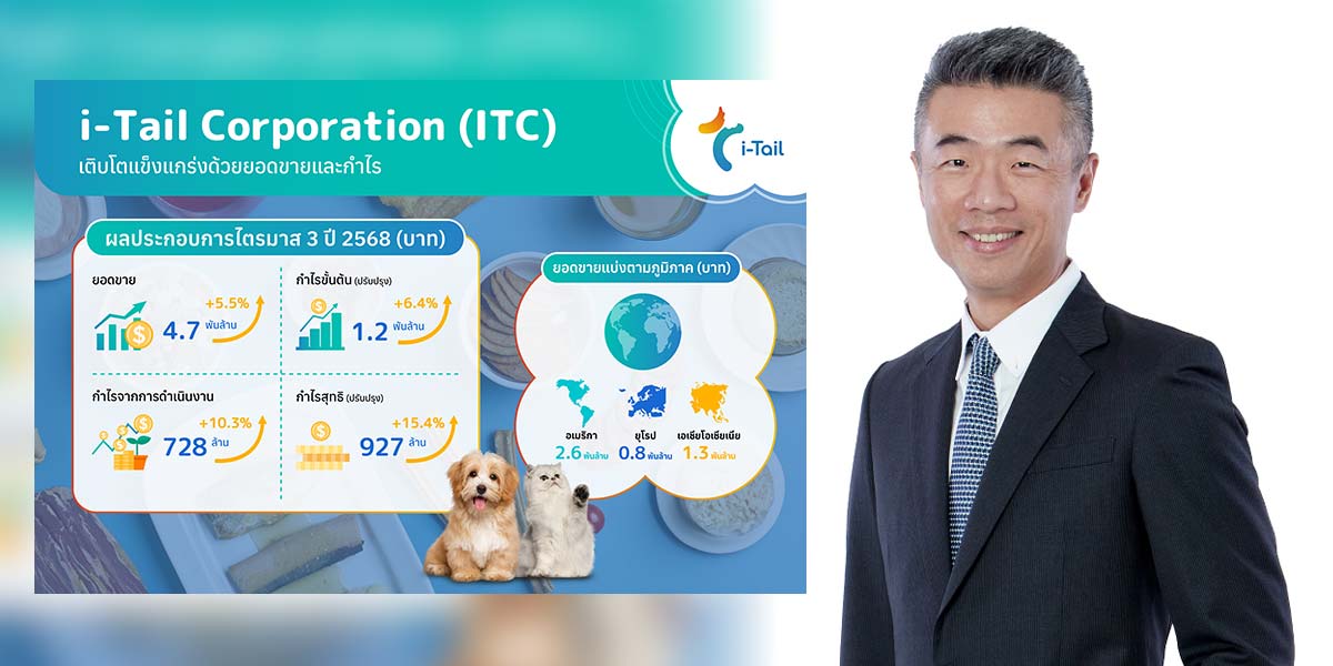 บริษัท ไอ-เทล คอร์ปอเรชั่น จำกัด (มหาชน) (ITC) ผู้นำระดับโลกในอุตสาหกรรมอาหารสัตว์เลี้ยง รายงานผลประกอบการไตรมาส 3 ปี 2568 ด้วยยอดขาย 4,721 ล้านบาท เติบโต 6.4% เมื่อเทียบกับช่วงเดียวกันของปีก่อน และเพิ่มขึ้น 5.5% จากไตรมาสก่อนหน้า โดยมียอดขายในสกุลดอลลาร์สหรัฐเพิ่มขึ้น 14.2% เมื่อเทียบกับปีก่อน อยู่ที่ 144 ล้านดอลลาร์สหรัฐ ซึ่งเป็นผลจากคำสั่งซื้อในตลาดสหรัฐอเมริกาและการขยายตลาดในยุโรป สะท้อนการเติบโตอย่างต่อเนื่องและความเชื่อมั่นจากลูกค้าแบรนด์อาหารสัตว์เลี้ยงชั้นนำ ทั้งนี้ บริษัทมีกำไรขั้นต้นปรับปรุงอยู่ที่ 1,192 ล้านบาท เพิ่มขึ้น 6.4% จากไตรมาสก่อน ขณะที่กำไรสุทธิปรับปรุงอยู่ที่ 927 ล้านบาท เพิ่มขึ้น 15.4% จากไตรมาสก่อนหน้า