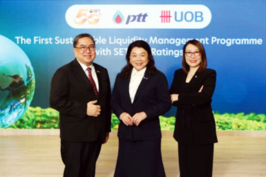 ขณะเดียวกัน ปตท. ยังร่วมกับ ธนาคารยูโอบี ประเทศไทย ตอกย้ำวิสัยทัศน์ธุรกิจเดินหน้าสู่ความยั่งยืนผ่านการบริหารทางการเงินที่เป็นเลิศ โดยร่วมลงทุนระยะสั้นผ่านโครงการบริหารสภาพคล่องเพื่อความยั่งยืน (Sustainable Liquidity Management Programme) ของธนาคารยูโอบี ประเทศไทย ซึ่งเป็นโครงการแรกที่เชื่อมโยงการบริหารสภาพคล่องขององค์กรเข้ากับผลการดำเนินงานด้านสิ่งแวดล้อม สังคม และธรรมาภิบาล โดยใช้ผลประเมินหุ้นยั่งยืนของตลาดหลักทรัพย์แห่งประเทศไทย (SET ESG Ratings) เป็นตัวชี้วัดหลัก