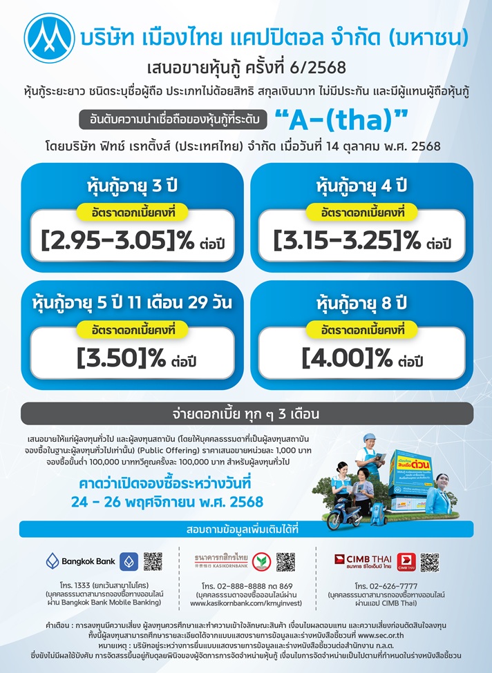 บริษัท เมืองไทย แคปปิตอล จำกัด (มหาชน) หรือ MTC เตรียมเสนอขายหุ้นกู้ใหม่จำนวน 4 ชุด ให้แก่ผู้ลงทุนทั่วไป และ ผู้ลงทุนสถาบัน (เฉพาะผู้ลงทุนสถาบันที่เป็นบุคคลธรรมดาเท่านั้นและให้จองซื้อในฐานะผู้ลงทุนทั่วไป) ประกอบด้วย หุ้นกู้อายุ 3 ปี อายุ 4 ปี อายุ 5 ปี 11 เดือน 29 วัน และอายุ 8 ปี คาดว่าจะเปิดจองซื้อระหว่างวันที่ 24-26 พฤศจิกายน พ.ศ. 2568 หุ้นกู้ดังกล่าวได้รับการจัดอันดับความน่าเชื่อถือที่ “A-(tha)” โดยบริษัท ฟิทช์ เรทติ้งส์ (ประเทศไทย) จำกัด เมื่อวันที่ 14 ตุลาคม พ.ศ. 2568