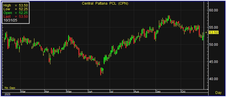 ผู้สื่อข่าวรายงานว่า วันนี้ (31 ต.ค.68) ราคาหุ้น บริษัท เซ็นทรัลพัฒนา จำกัด (มหาชน) หรือ CPN ณ เวลา 10:12 น. อยู่ที่ระดับ 53.50 บาท บวก 1.00 บาท หรือ 1.90% ราคาสูงสุดอยู่ที่ 53.50 บาท ราคาต่ำสุดอยู่ที่ 52.25 บาท ด้วยมูลค่าการซื้อขาย 80.67 ล้านบาท