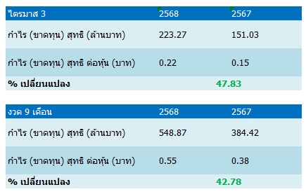โดยกำไรสุทธิไตรมาส 3/68 ทำสถิติสูงสุดใหม่ที่ 223 ล้านบาท เพิ่มขึ้น 47.8% จากช่วงเดียวกันของปีก่อน โดยมีอัตรากำไรสุทธิอยู่ที่ 13.2% สะท้อนถึงประสิทธิภาพการดำเนินงานที่ต่อเนื่อง