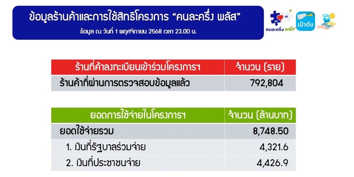 กระทรวงการคลังอัปเดตโครงการ “คนละครึ่ง พลัส” ล่าสุด ณ วันที่ 1 พ.ย. 2568 มียอดใช้จ่ายรวม 8,748.50 ล้านบาท แบ่งเป็นเงินรัฐ 4,321.60 ล้านบาท และประชาชน 4,426.90 ล้านบาท