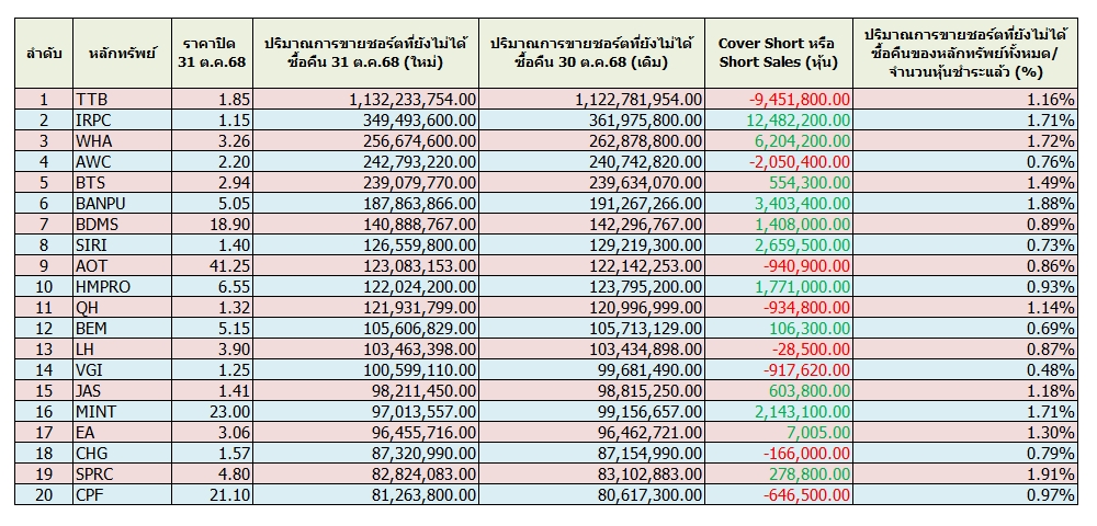 ข้อมูลสิ้นสุด 31 ต.ค.68 พบ TTB มีปริมาณชอร์ตคงค้างเหลือมากสุด 1,122 ล้านหุ้น คิดเป็น 1.16% ขณะที่ IRPC ถูก Cover Short สูงสุด 12 ล้านหุ้น ส่วน TTB ถูก Short Sales สูงสุด 9 ล้านหุ้น