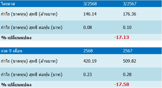 ขณะที่ผลประกอบการงวด 9 เดือนปี 68 มีกำไรสุทธิอยู่ที่ 420.19 ล้านบาท ลดลง 17.58% เมื่อเทียบกับงวดเดียวกันของปีก่อนมีกำไรสุทธิ 509.82 ล้านบาท สาเหตุหลักมาจากความสามารถในการทำกำไรจากการดำเนินงานที่ลดลง อันเป็นผลจากการแข่งขันทาง การตลาดที่ทวีความรุนแรงขึ้น ซึ่งกดดันอัตราผลตอบแทนจากค่าขนส่งสินค้า (freight yield) สะท้อนถึงการเปลี่ยนแปลง ของอุตสาหกรรมที่มีความผันผวนและอยู่ในช่วงเปลี่ยนผ่านเมื่อเทียบกับปีก่อนหน้า