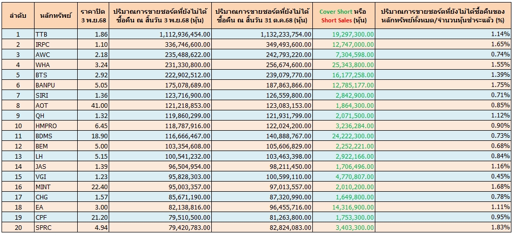 เปิด 20 อันดับหุ้นถูก “Cover-Short” สูงสุด ณ 3 พ.ย.68