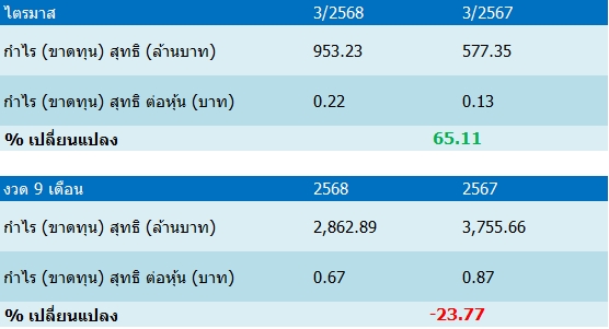ขณะที่ผลประกอบการงวด 9 เดือนแรกปี 68 มีกำไรสุทธิอยู่ที่ 2,862.89 ล้านบาท ลดลง 23.77% เมื่อเทียบกับงวดเดียวกันของปีก่อนมีกำไรสุทธิ 3,755.66 ล้านบาท