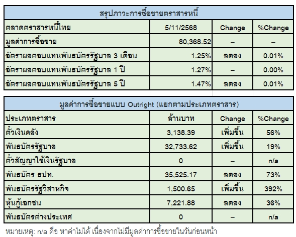 สมาคมตลาดตราสารหนี้ไทย (ThaiBMA) สรุปภาวะตลาดตราสารหนี้ประจำวันที่ 5 พฤศจิกายน 2568 พบว่ามีมูลค่าการซื้อขายรวมทั้งวันอยู่ที่ 80,369 ล้านบาท โดยนักลงทุนหลักที่มีมูลค่าการซื้อขายสูงสุดสองอันดับแรก ได้แก่ กลุ่มบริษัทหลักทรัพย์จัดการกองทุน (บลจ.) ซื้อสุทธิ 1,216 ล้านบาท และกลุ่มบริษัทประกัน ซื้อสุทธิ 1,285 ล้านบาท ขณะที่นักลงทุนต่างชาติซื้อสุทธิสูงสุด 5,333 ล้านบาท ส่งผลให้เกิดกระแสเงินทุนไหลเข้า (Net Inflow) 5,332 ล้านบาท หลังหักตราสารหนี้ที่หมดอายุจำนวน 1 ล้านบาท
