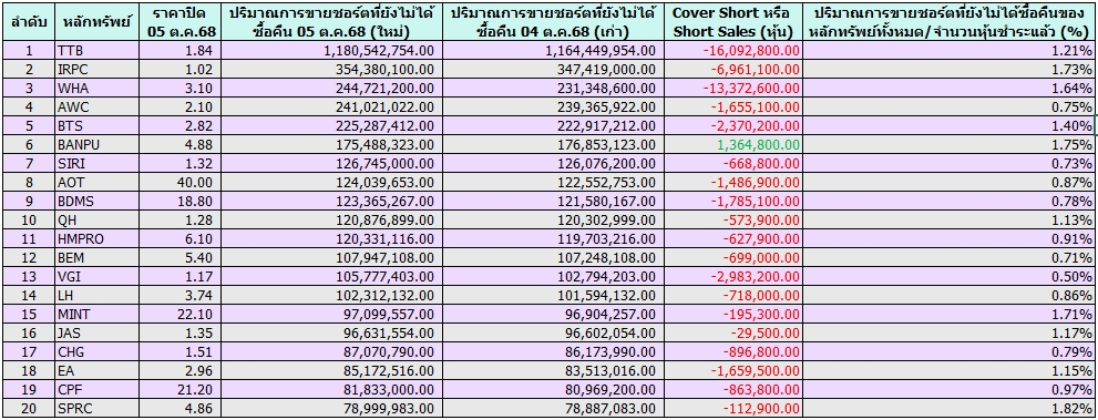 เปิด 20 อันดับหุ้นถูก “Cover-Short” สูงสุด ณ 5 พ.ย.68