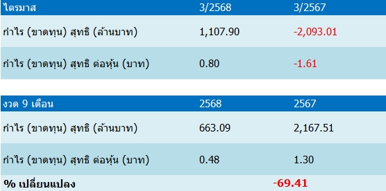 ขณะที่ผลประกอบการงวด 9 เดือนปี 68 มีกำไรสุทธิอยู่ที่ 663.09 ล้านบาท ลดลง 69.41% เมื่อเทียบกับงวดเดียวกันของปีก่อนมีกำไรสุทธิ 2,167.51 ล้านบาท