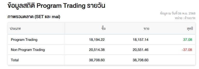 ผู้สื่อข่าวรายงานว่า วันนี้ (6 พ.ย.68) ตลาดหลักทรัพย์แห่งประเทศไทย (ตลท.) เปิดเผยข้อมูลซื้อขายรายวันผ่าน Program Trading หรือ “โปรแกรมโรบอทเทรดดิ้ง” พบว่ามีมูลค่าซื้อจำนวน 18,194.22 ล้านบาท และมูลค่าขายจำนวน 18,157.14 ล้านบาท เท่ากับซื้อสุทธิ 37.08 ล้านบาท